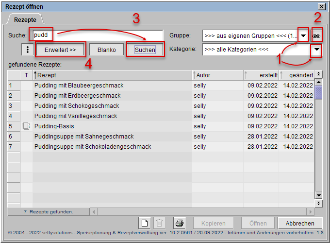 Suche (s. Markierung 3). Bei einem Suchvorgang wird über den Rezeptnamen, die