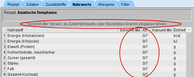 Bei diesem Rezept ist für keine Zutat ein Nährwert zugeordnet, d. h., die Spalte berechn. Me. ist leer. Somit wird in der Spalte Art. pro Nährstoff der