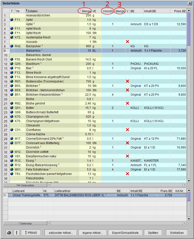 Entsprechend der Bestelleinheit des einzelnen Lieferartikels wird pro Artikel die kleinstmöglichste Bestelleinheit in der Spalte Vorschl. (Vorschlag, s. Markierung 2) ausgegeben.