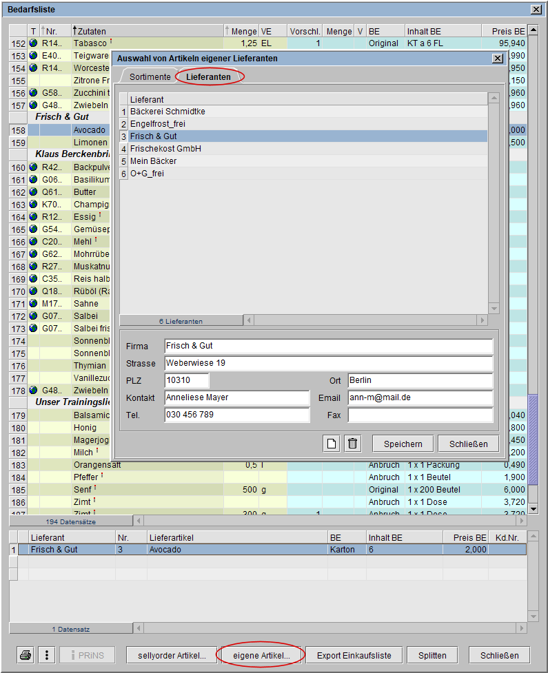 eigene Lieferanten und dazugehörige