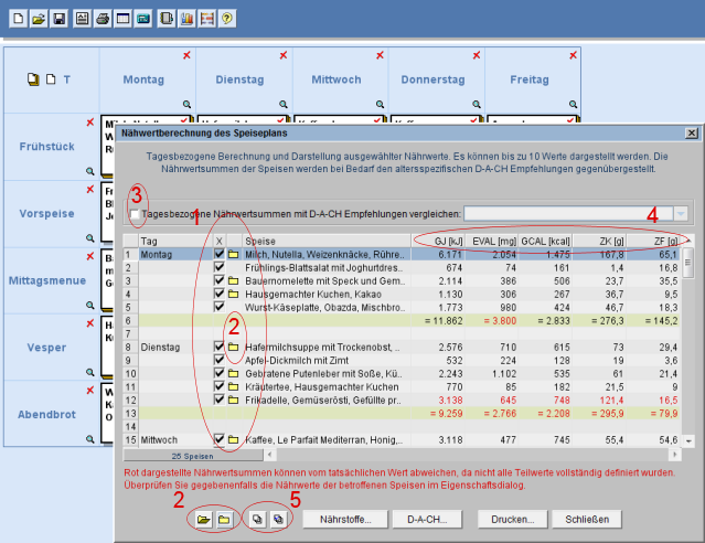 Sie kehren über die Schaltfläche [Berechnung...] (s. Markierung 4) zur Nährwertberechnung des Speiseplans zurück.