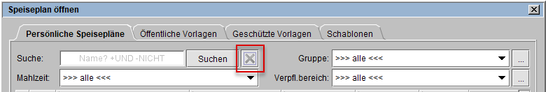 Im Dialog Speiseplan öffnen kann nach einer Zeichenfolge im Namen des Speiseplanes gesucht werden. Sie geben das Suchwort in das Feld Suche ein. Nutzen Sie mehrere Suchbegriffe können diese mit einem Pluszeichen als UND bzw. mit einem Minuszeichen als ODER verwendet werden.