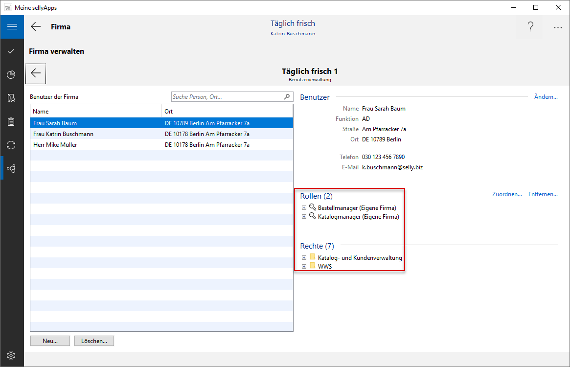 Die zugeordneten Rollen Katalog- und Kundenmanager (s. Bild l. Markierung), führen bei dem Mitarbeiter Mike Müller (s. Bild r. Markierung