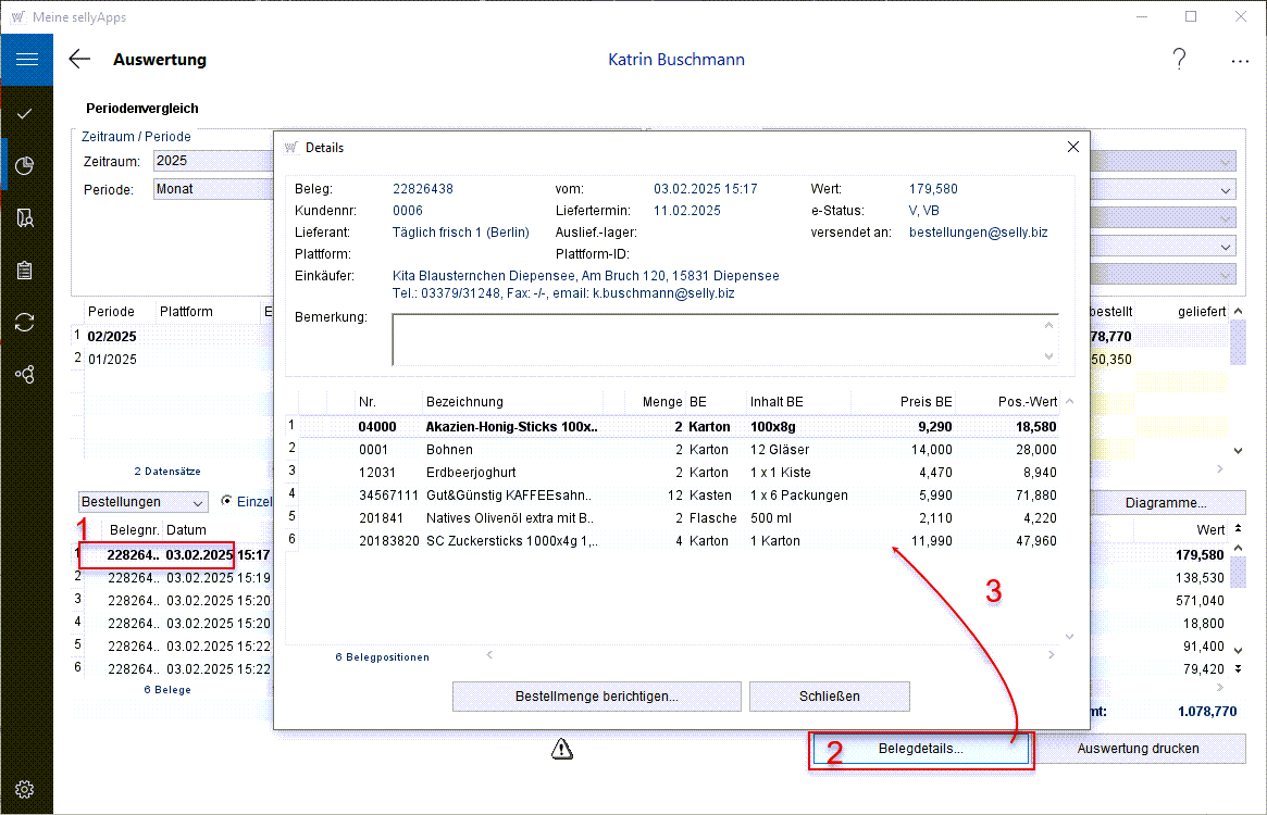 (s. Markierung 3) . Im Beispiel sind 6 Bestellungen erfolgt.