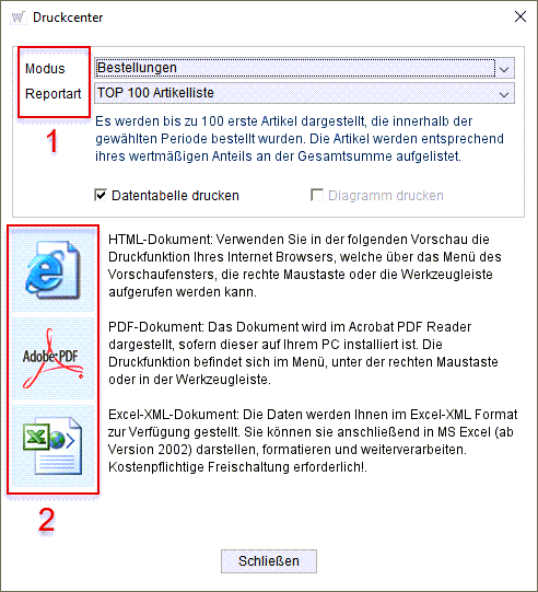 Nachfolgend entscheiden Sie sich für eine Reportart (s. Markierung 2). Sie wählen zwischen dem Periodenvergleich, Top 100 Artikelliste, Flop 100 Artikelliste und dem Jahresvergleich.