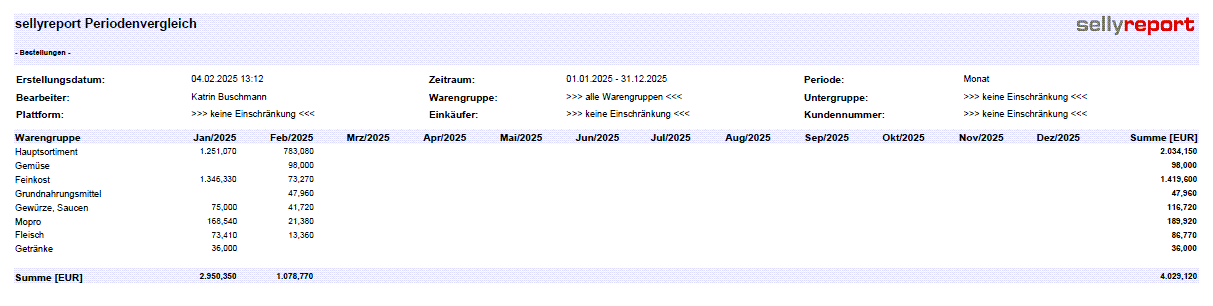 Die gewählte monatliche Ansicht zeigt für den Januar 2025 einen Bestellwert von 2.950,350 Euro und für den Februar 2025 einen Wert von 1.078,770 Euro.
