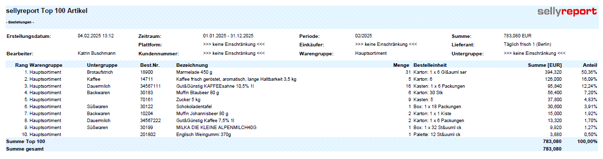 Es werden bis zu 100 letzte Artikel dargestellt, die innerhalb der gewählten Periode bestellt wurden. Die Artikel werden entsprechend ihres wertmäßigen Anteils an der Gesamtsumme