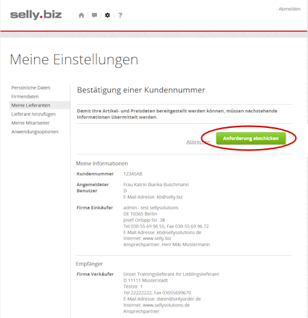 Datenanforderung an Ihren Lieferanten absenden, bekommen Sie eine Zusammenfassung der Daten, die an Ihren Lieferanten übermittelt werden.