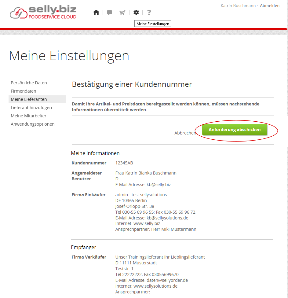 das Absenden einer Anforderung im Feld Kundennr. (s. Markierungen 2)
