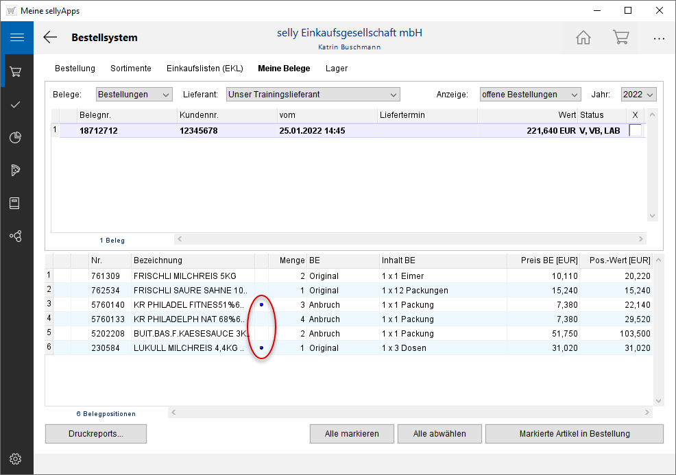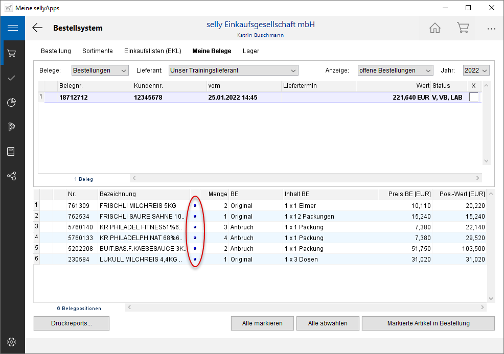 Sie markieren die Artikel, die Sie in Ihre Bestellung übernehmen möchten, klicken auf Markierte Artikel in Bestellung und sehen nachfolgend alle übernommenen Artikel mit