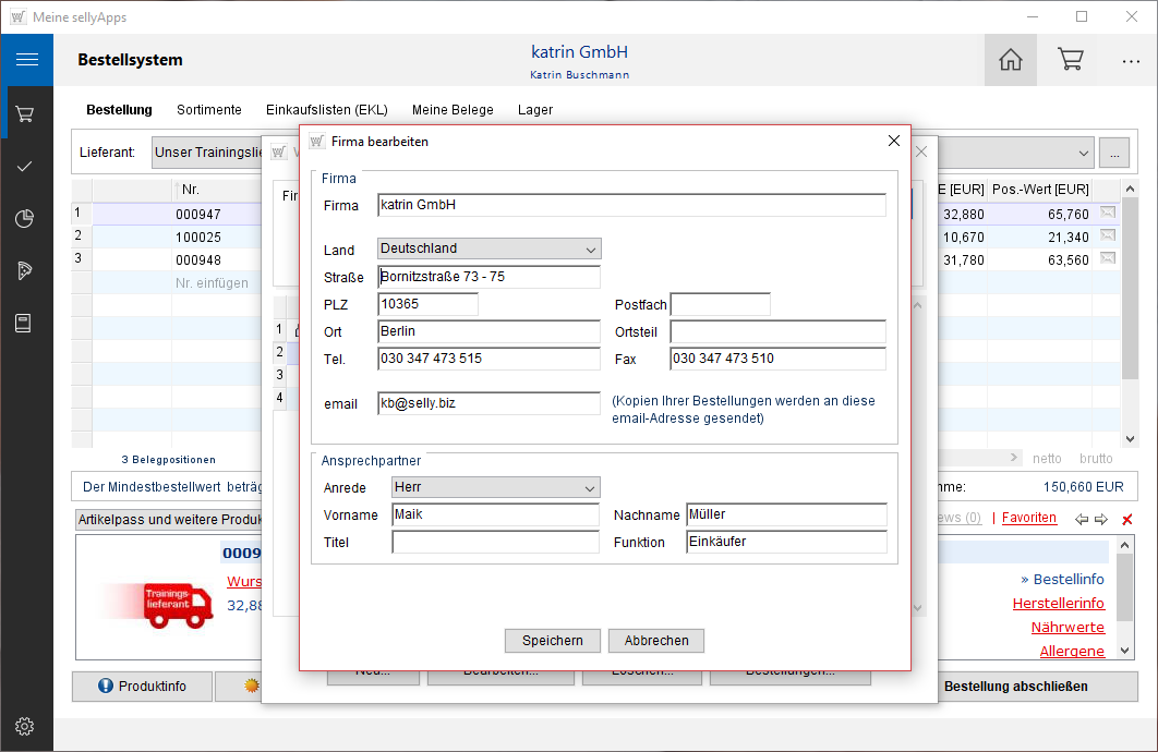 Bereich Bestellsystem sellyorder bzw. der Bestell-App