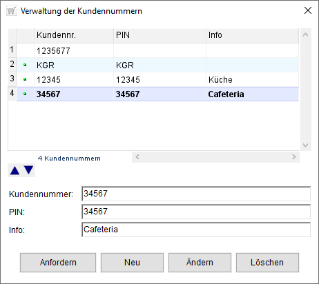 Zum Ändern von Freischaltdaten, d. h., Änderung einer Kundennummer und eines PIN-Codes, markieren Sie die Zeile in der Liste, ändern zuerst die entsprechenden Daten und klicken nachfolgend auf die Schaltfläche [Ändern]. Analog gilt dies für das Eintragen einer zusätzlichen Information zur Kundennummer in der Spalte Info.