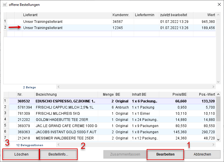 Benötigen Sie eine vorbereitete Bestellung nicht mehr bzw. wollen diese nicht abschließen, wählen Sie nach Markieren der Bestellung in der Liste die Schaltfläche [Löschen] (s. Markierung 3) (s. a. Hinweis).
