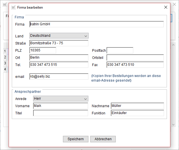 In der Einkäuferverwaltung innerhalb vom Bestellsystem sellyorder können Sie Ihre Firmendaten und Haupteinkäuferdaten aktualisieren, welche Sie bei der Registrierung erfasst haben. Wichtig ist hier u. a. die Angabe der E-Mail-Adresse für die Bestellbestätigung.