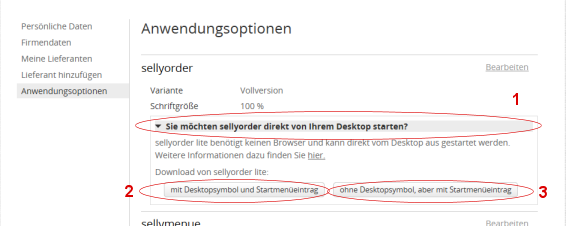 Sie erhalten die Auswahl der Startvarianten mit Klick auf die Funktion Sie möchten sellyorder direkt von Ihrem Desktop starten? (s.