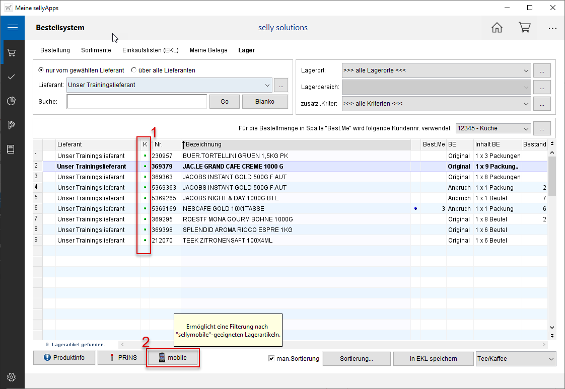 Im Bereich Lager nehmen Sie die Filterung der Lagerartikel nach "sellymobile-geeigneten" Artikeln vor (s. Markierung 1).