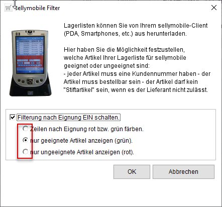 Sie erhalten den Dialog sellymobile Filter zur Auswahl der Filteroption (s. rechts).