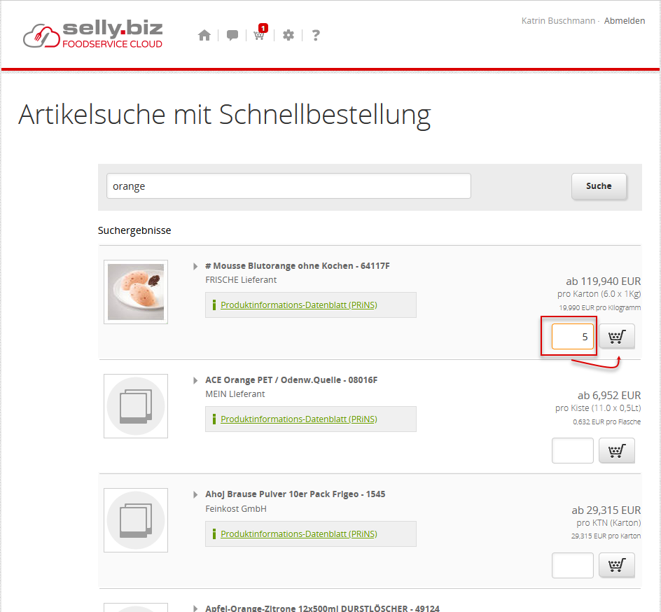 Die Suche erfolgt über alle Lieferanten, die Sie Ihrem Benutzerkonto zuordnet und freigeschaltet haben und deren Sortimente.
