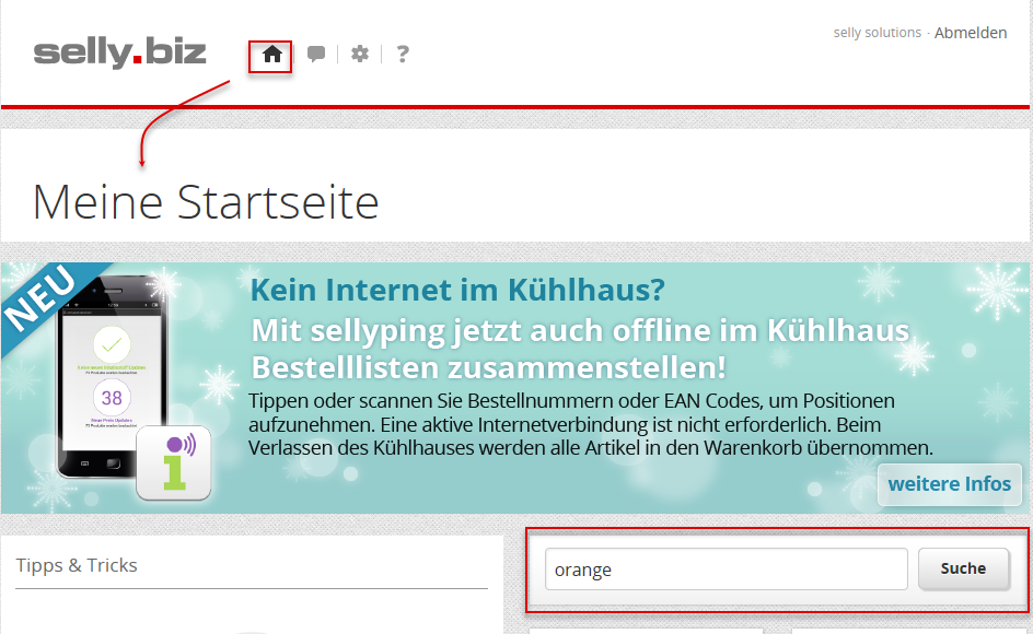 Nach der Anmeldung öffnet sich die Startseite Meine Startseite, in der Sie Ihren Suchbegriff im Suchfeld eintragen (im Beispiel Orange) und mit Klick auf [Suche] den Suchvorgang starten.