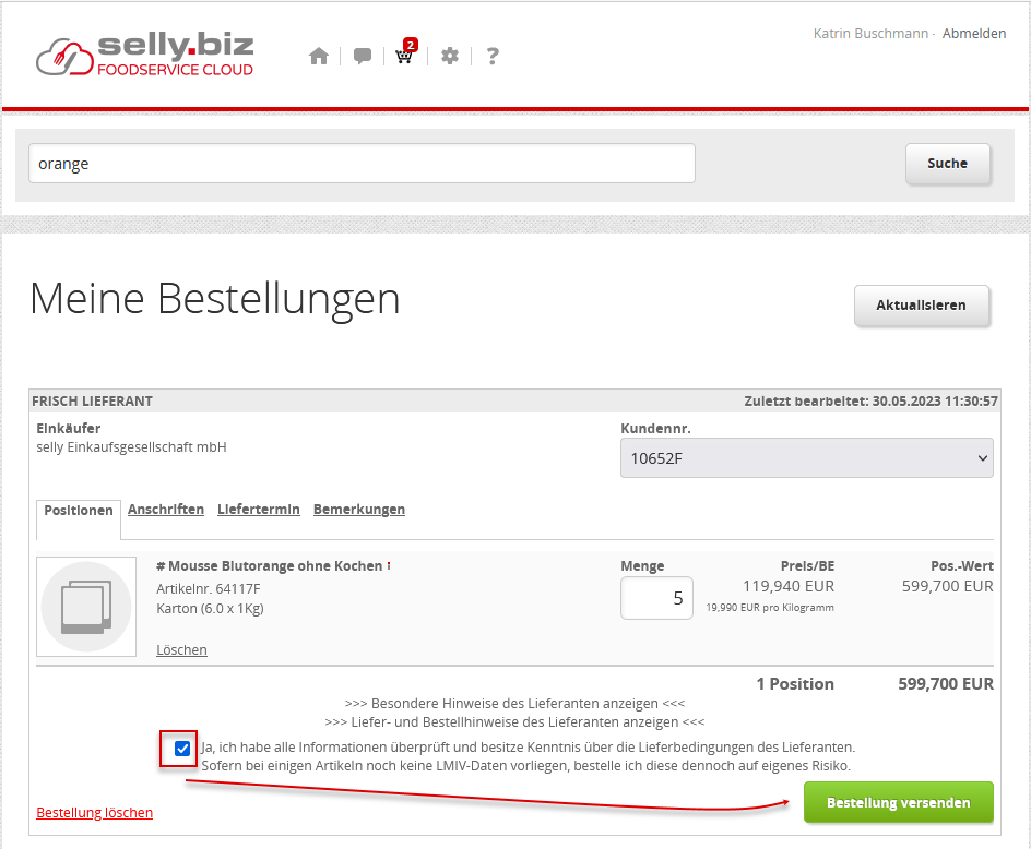 Abschließend wählen Sie, falls notwendig,. eine andere Kundennummer (s. a. Kundennummerwechsel) aus der Liste, kontrollieren die Anschriften (Liefer- und Rechnungsanschrift, geben ggfs. eine Bemerkung ein und schließen den Bestellvorgang mit Klick auf [Bestellung versenden] ab.
