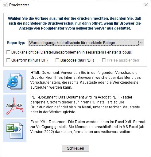 Zusätzlich können Sie sich für eine Druckansicht im separatem Fenster, einen Ausdruck im Querformat (nur bei PDF-Druck möglich) und einen Barcodeausdruck entscheiden.