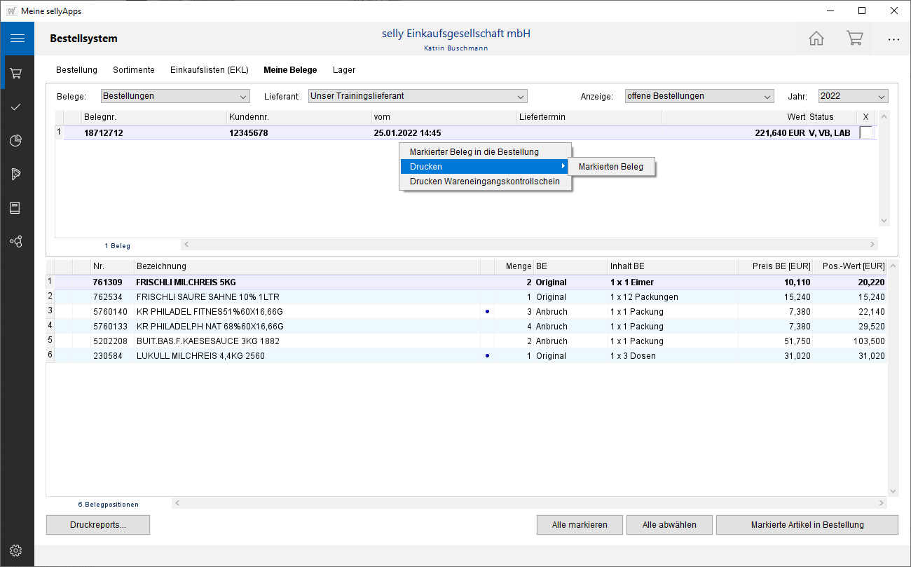 Zusatzmenü mit dem weiteren Menüpunkt Drucken Wareneingangskontrollschein.