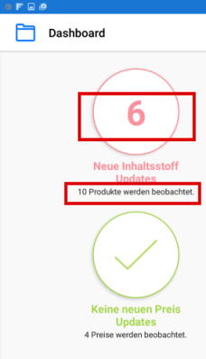 Im Beispiel links werden 6 Inhaltsstoffupdates angezeigt, d. h. bei sechs Artikeln wurden die Inhaltsstoffe geändert.