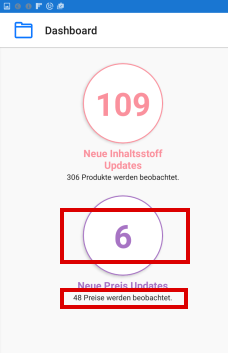 In den Kreisen auf dem Startbildschirm ist jeweils die Anzahl die Inhaltsstoff- bzw. Preisupdates (Änderungen) zu finden.