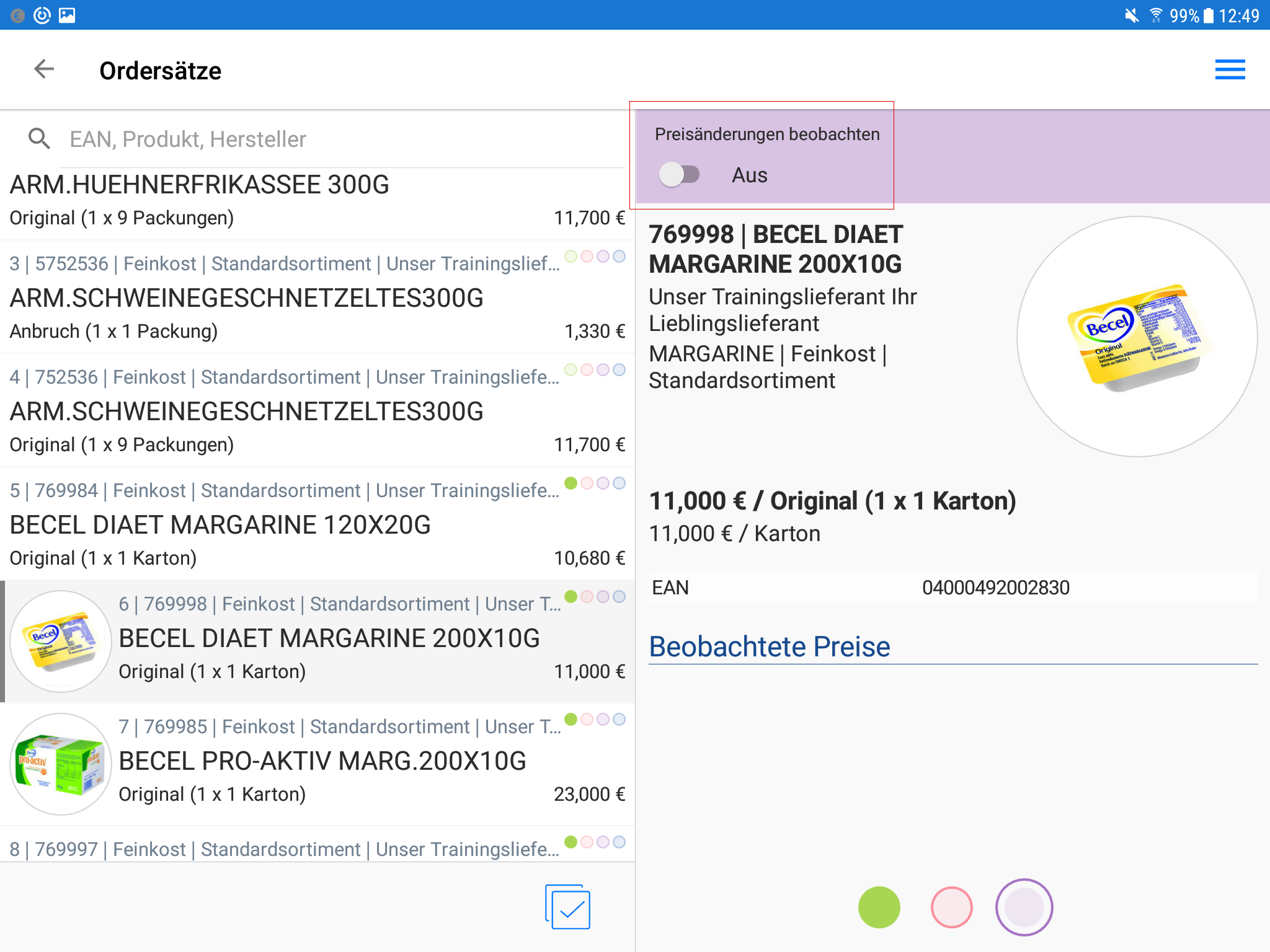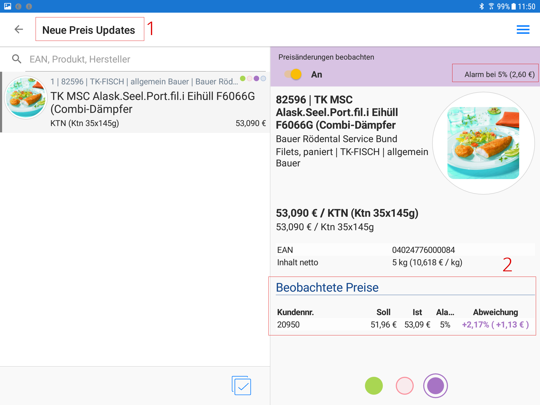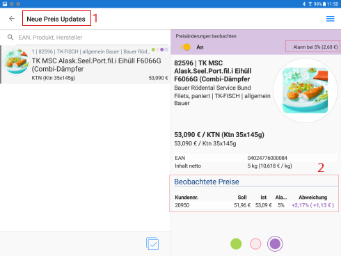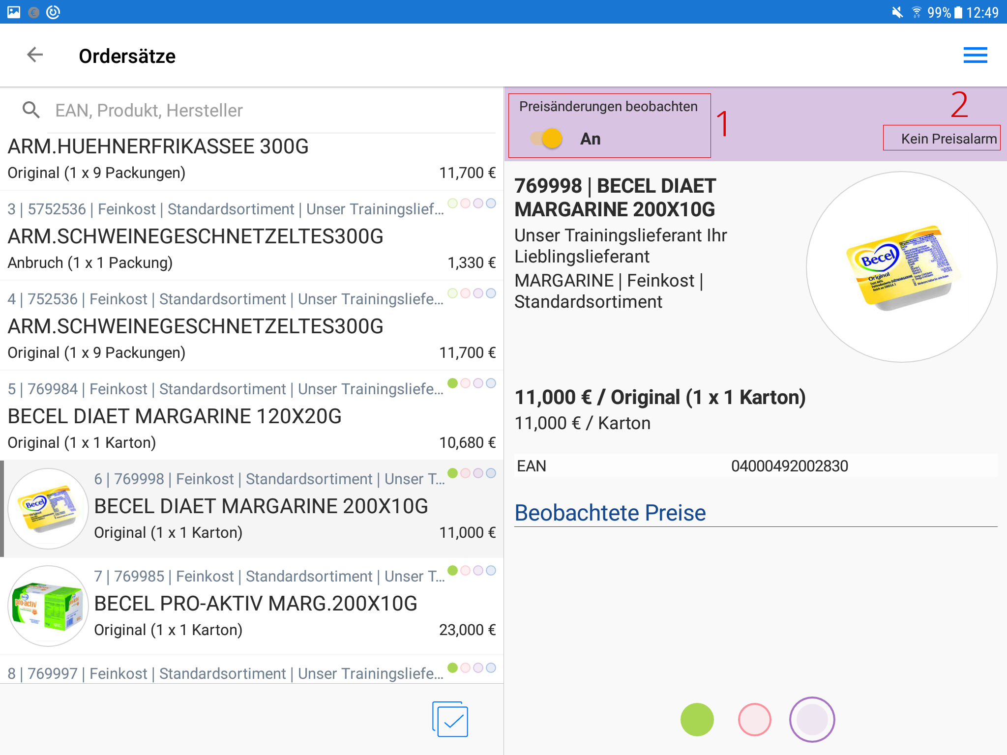 In dieser Ansicht ist für den markierten Artikel der Schalter Preisänderungen beobachten aktiviert (s. Markierung 1). Eine prozentuale Abweichung wurde noch nicht definiert (s. Markierung 2).