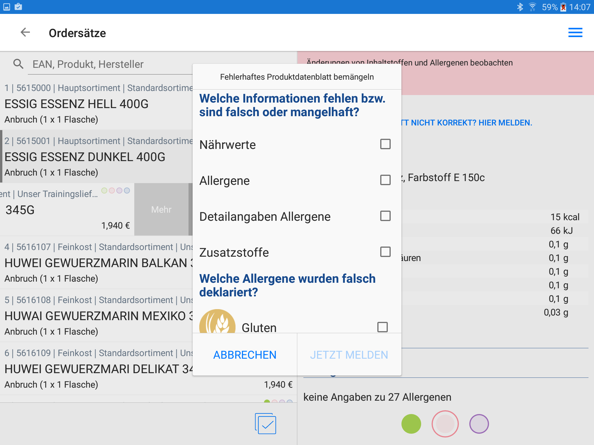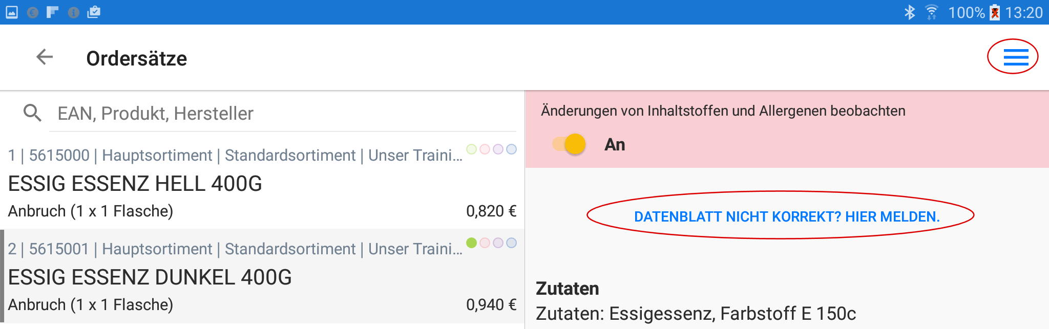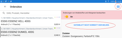 Inhaltsstoffe/Allergene beobachtenDen markierten Artikel auf die Beobachtungsliste setzen, um über Änderungen von Inhaltsstoffen/Allergenen informiert zu werden. Die Anzeige von Änderungen erfolgt auf der Startseite. Ein Datenblatt kann bewertet werden.