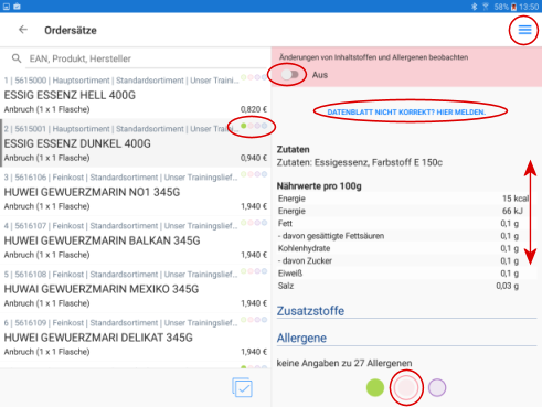Markieren Sie einen Artikel, werden rechts im Fenster die Inhaltstoffe dargestellt. Sie können sich informieren und die Änderungen bestätigen (s. o. Markierungen 1). Damit ist dieses Produkt aus der Änderungsliste heraus. In Ihrer Beobachtungsliste bleibt das Produkt aber weiterhin erhalten.