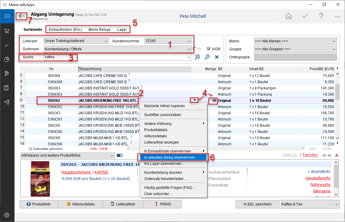 Geben Sie hier die Menge ein (s. Markierung 4) und verlassen diese Bearbeitungsansicht über den Zurück-Pfeil (s. Markierung 7), haben Sie den oder die Artikel in Ihren Beleg übernommen (s. Markierung 4). Das erfolgt ebenso, wenn Sie im Kontextmenü den Eintrag In den aktuellen Beleg anklicken (s. Markierung 6).