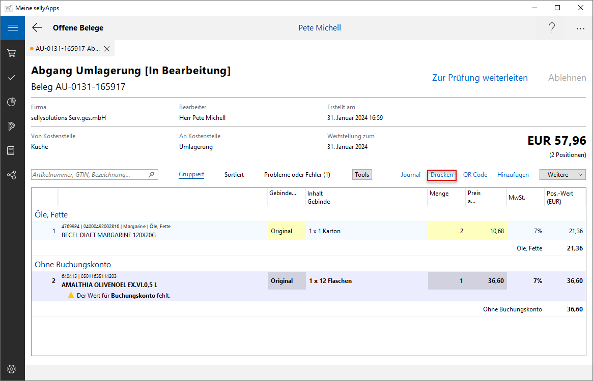 Alle Ihre erzeugten Belege über Warenbewegungen können Sie ausdrucken. Sie öffnen dazu die Belegdetails und nutzen dort den Funktionslink Drucken.