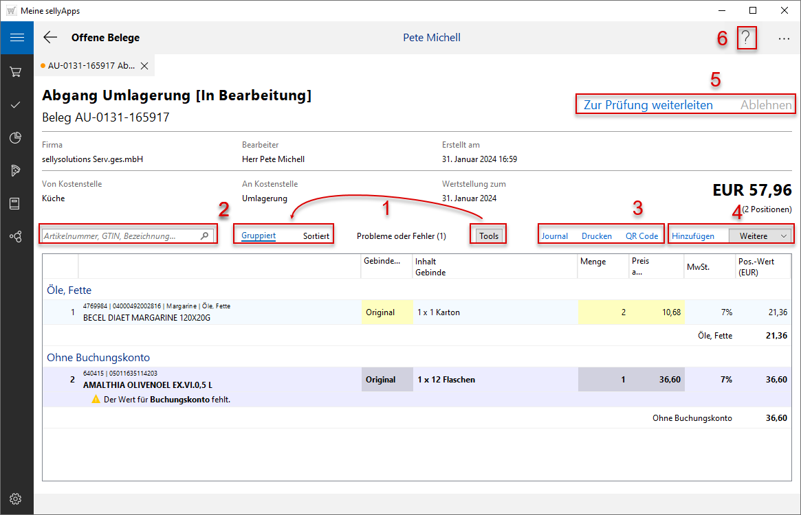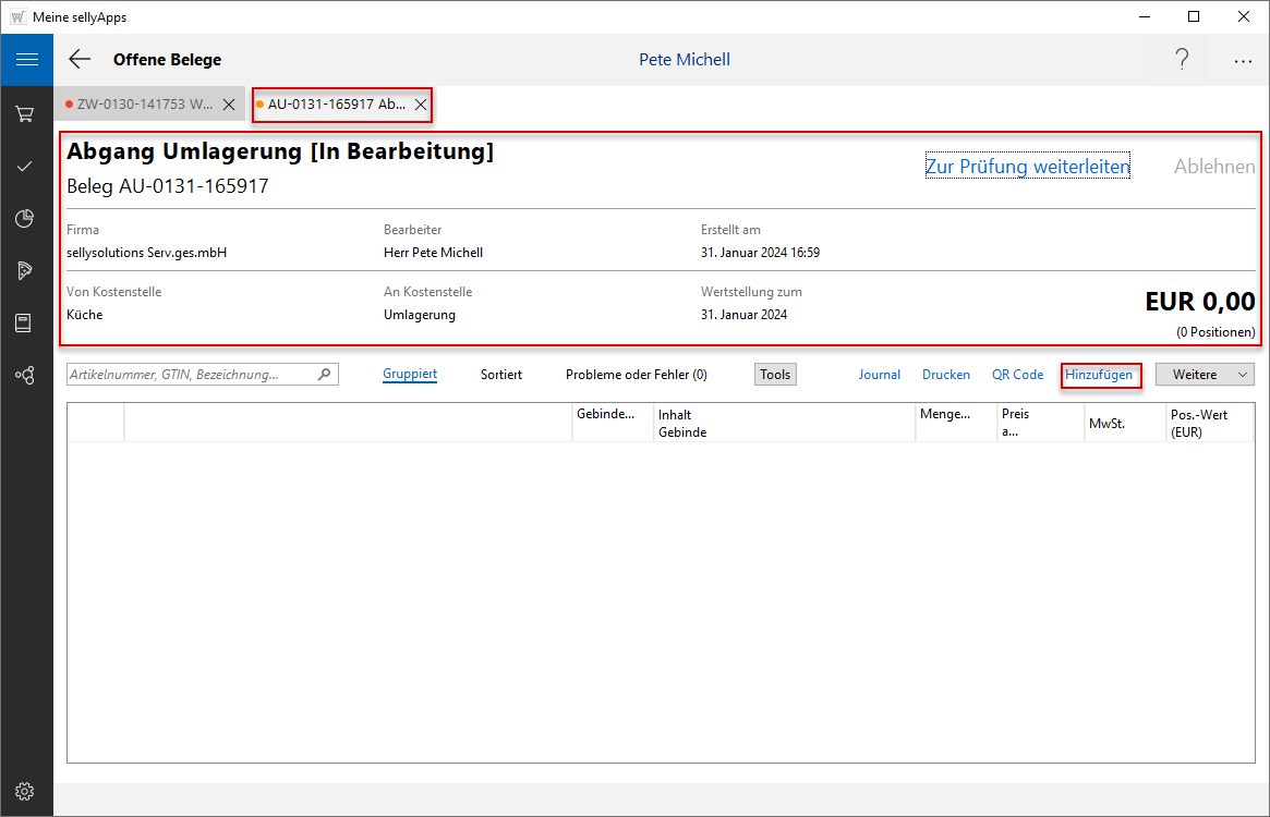 In der Detailsansicht Ihres Umlagerungsbeleges sind zunächst nur die Kopfdaten (s. Markierung).