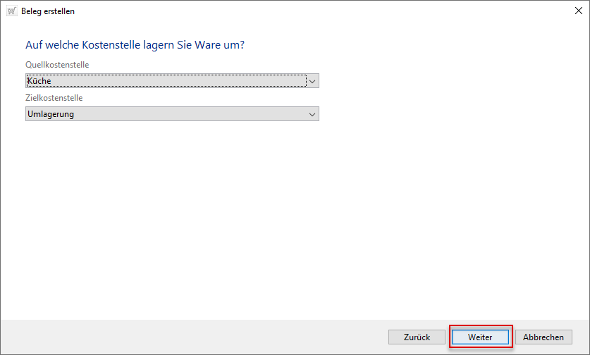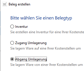 Nach dem ersten Schritt, dem Klick auf [Neu...] in der Belegübersicht, wählen Sie den Belegtyp Abgang Umlagerung und wechseln zum nächsten Schritt mittels Schaltfläche [Weiter].