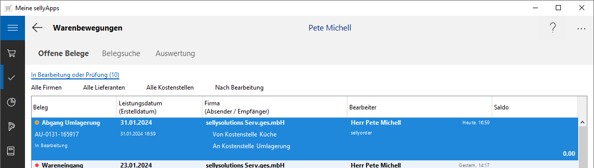 In unserem Beispiel wurde ein Beleg für einen Abgang Umlagerung erzeugt.