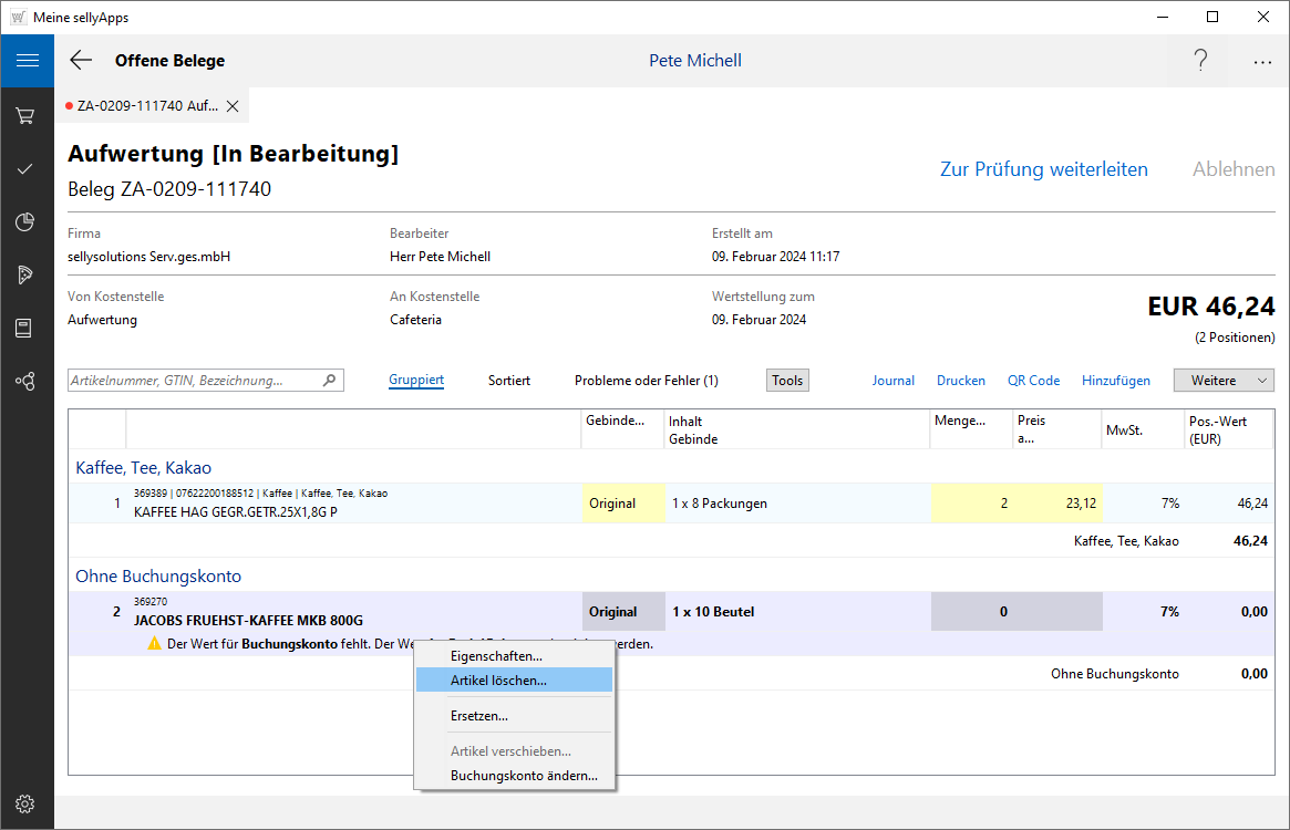 Quittieren Sie die Systemnachfrage mit Klick auf die Schaltfläche [Jetzt löschen], wird die Position aus dem Beleg entfernt.