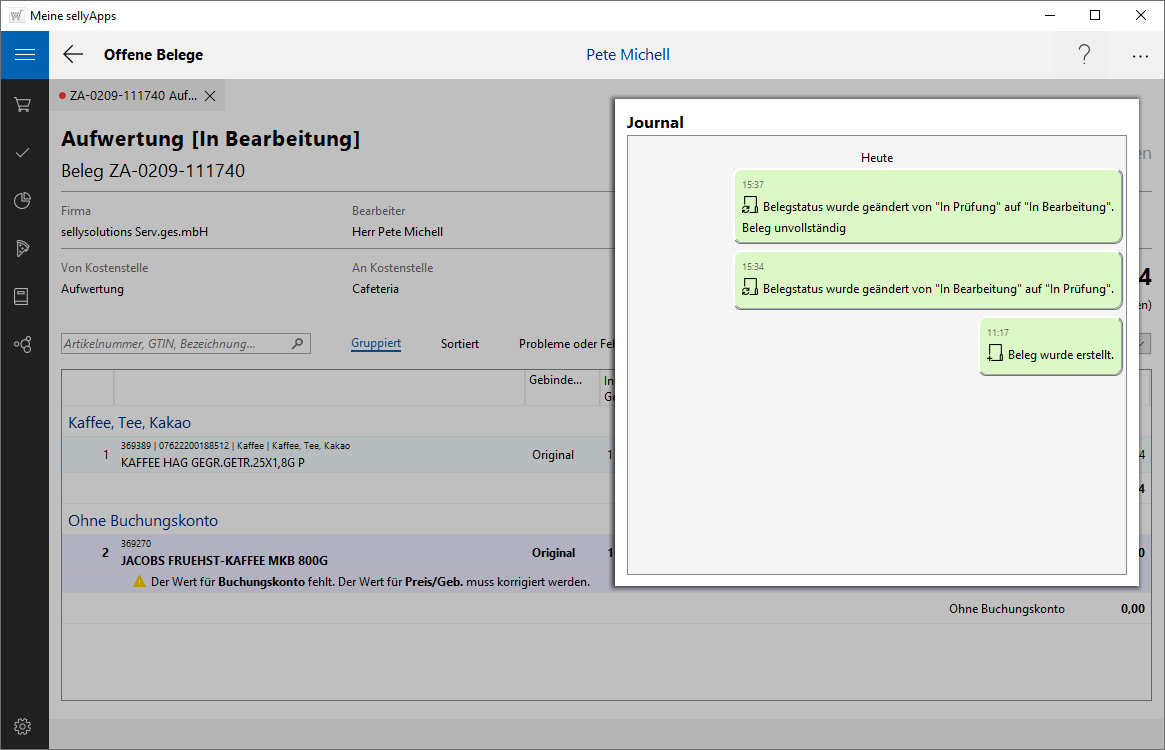 Für jeden erzeugten Beleg hinsichtlich Warenbewegungen in den sellyApps, werden wichtige Belegänderungen im Journal dokumentiert.
