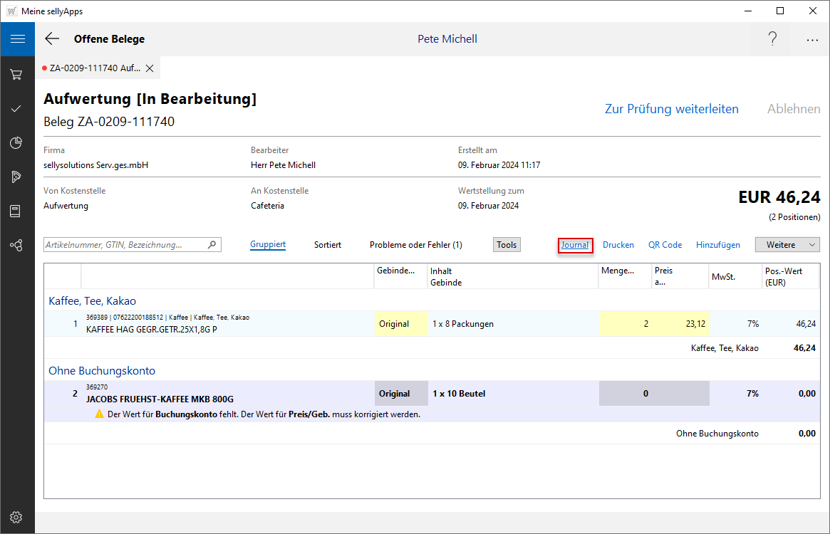 In der Ansicht der Belegdetails nutzen Sie die Journalfunktion (s. Markierung).