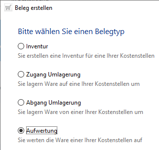 Den ersten Schritt erledigen Sie in der Belegübersicht, den Klick auf [Neu...] und wählen anschließend den Belegtyp Aufwertung. Mittels Schaltfläche [Weiter] wechseln Sie zum nächsten Schritt.
