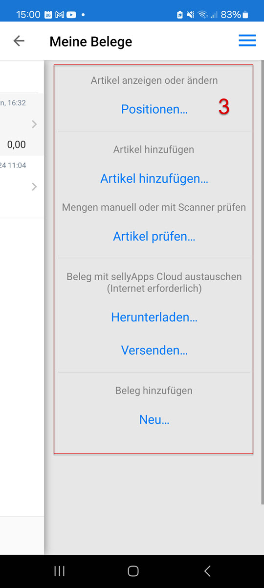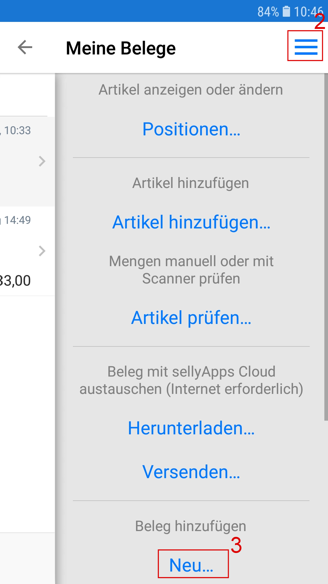 Über Meine Belege (s. rechts Markierung 1) und nachfolgendem Anwählen des Menü-Icons (s. rechts Markierung 2) öffnet sich die Funktionsübersicht in der Sie Neu... wählen (s. rechts Markierung 3).