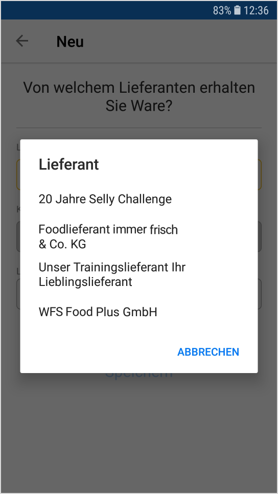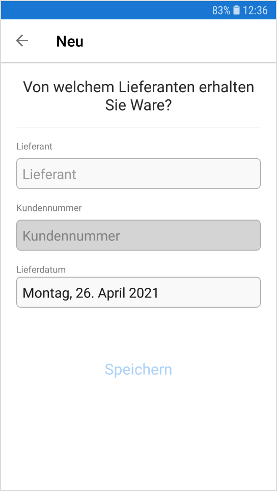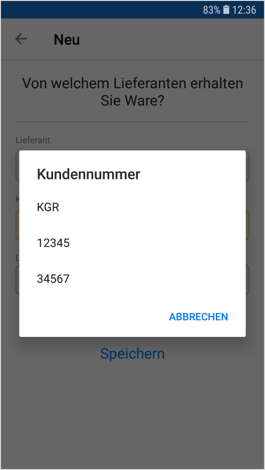 Im Nächsten Schritt wählen Sie den Lieferanten, von welchem Sie bspw. bei einem Wareneingang, die Ware beziehen, die zutreffende Kundennummer und das Lieferdatum aus.