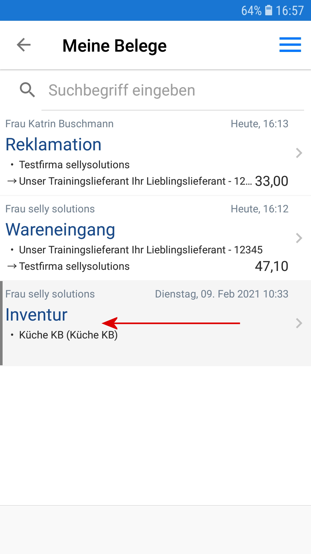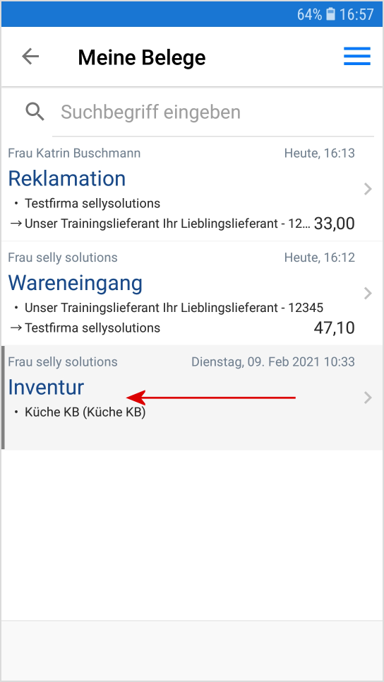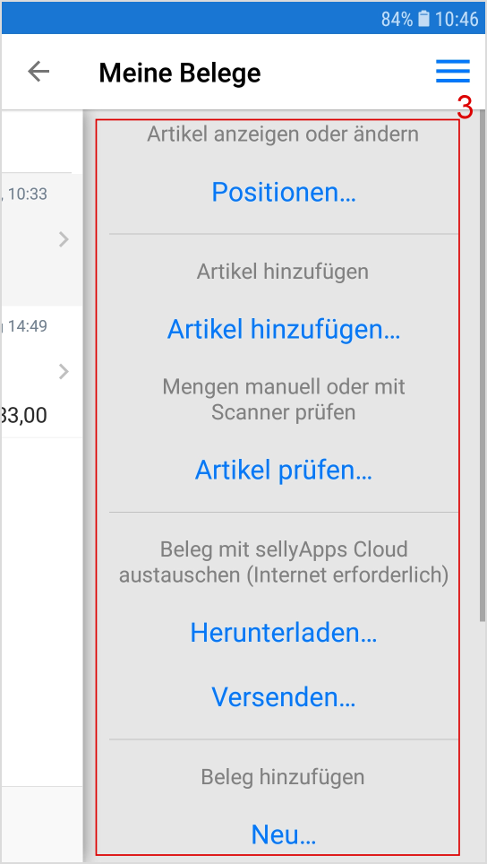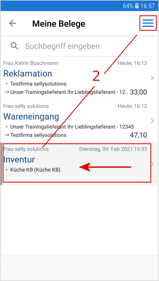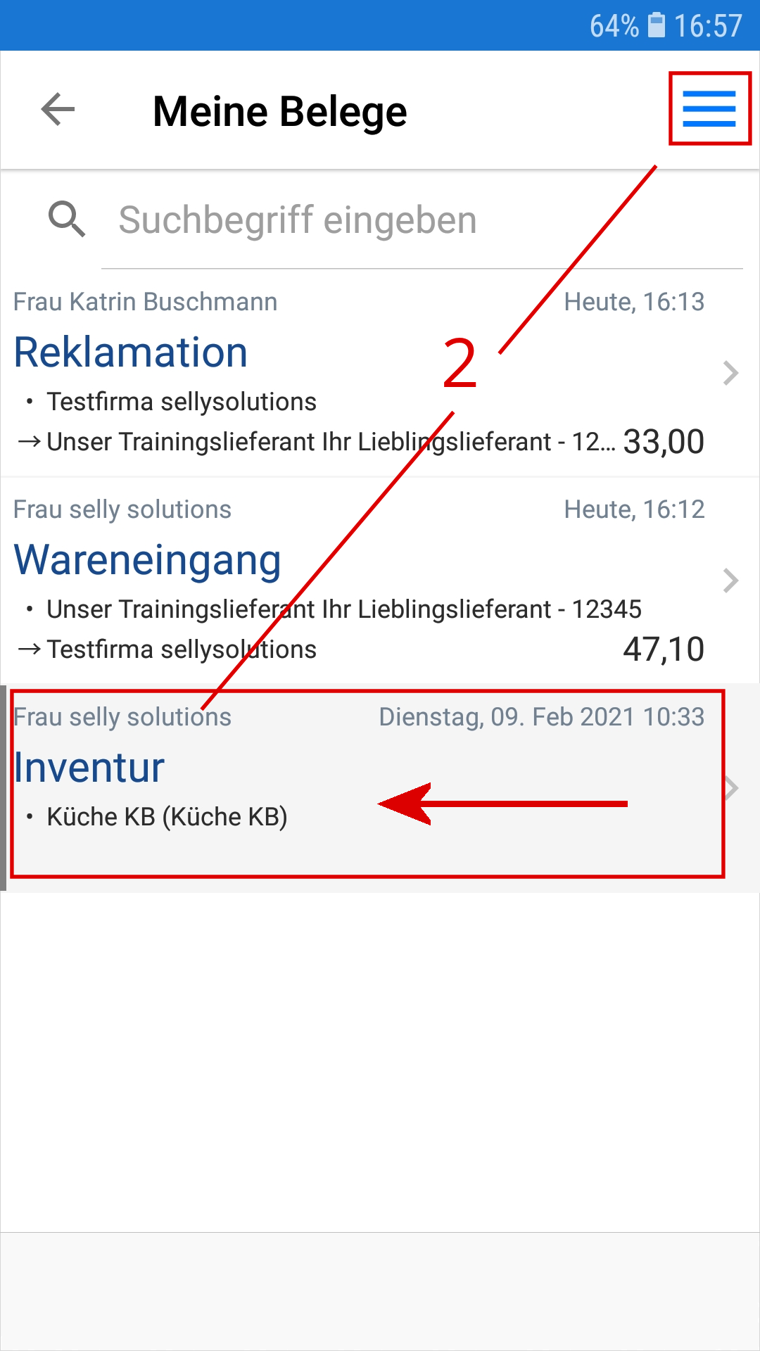 Sie wählen den Beleg, den Sie bearbeiten möchten, durch Antippen, entweder des Menü-Icons oder der Belegzeile, aus (s. rechts Markierung 2).