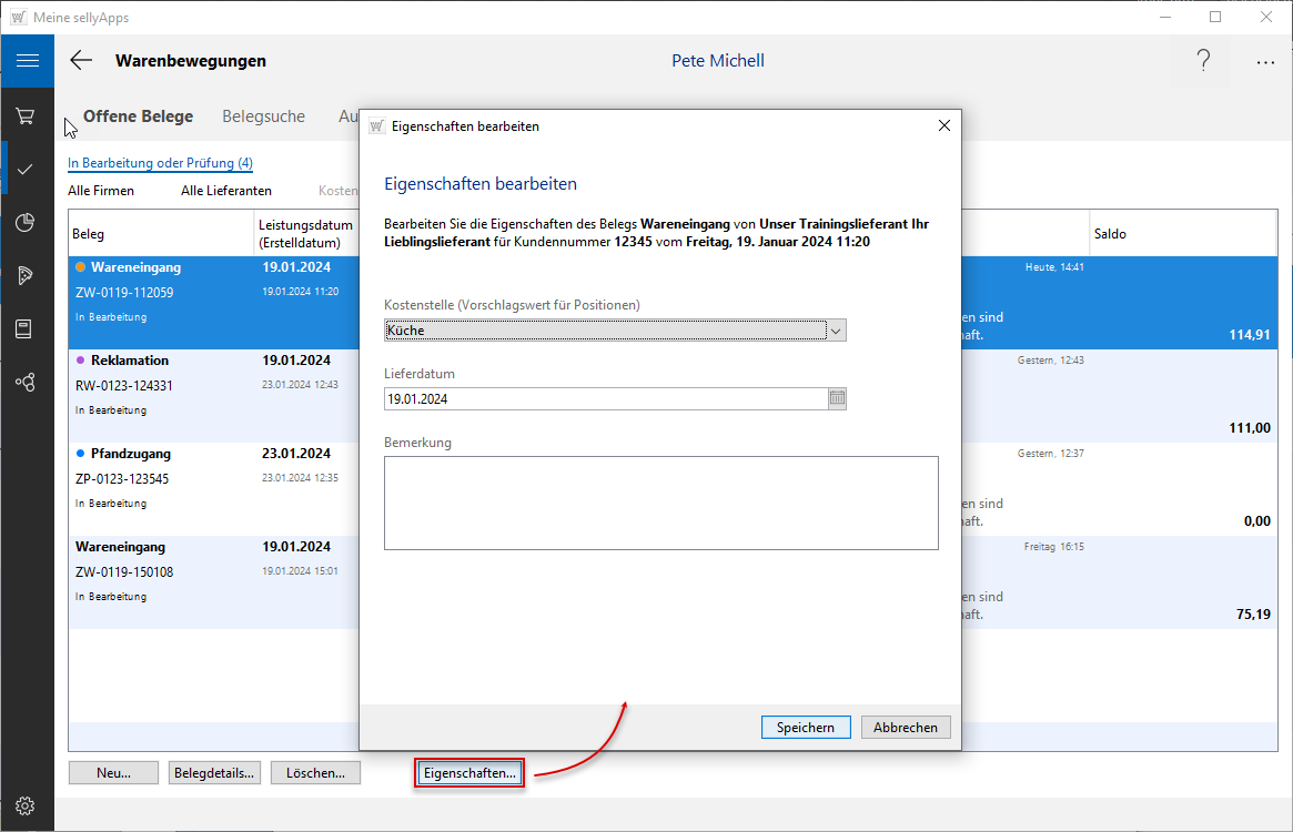 Ändern Sie die Angaben der Kostenstelle oder des Lieferdatums bzw. tragen eine Bemerkung ein, speichern Sie diese Belegänderungen mit Klick auf gleichnamige Schaltfläche.