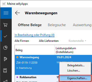 Zur Ansicht der Belegeigenschaften gelangen Sie mittels Schaltfläche [Eigenschaften...] (s. Markierung links) oder durch Klick der rechten Maustaste auf den markierten Beleg in der Übersichtstabelle und Anwahl des Eintrages Eigenschaften... im Kontextmenü.