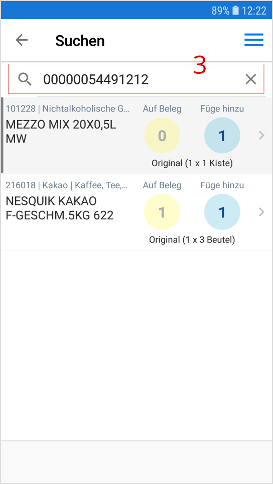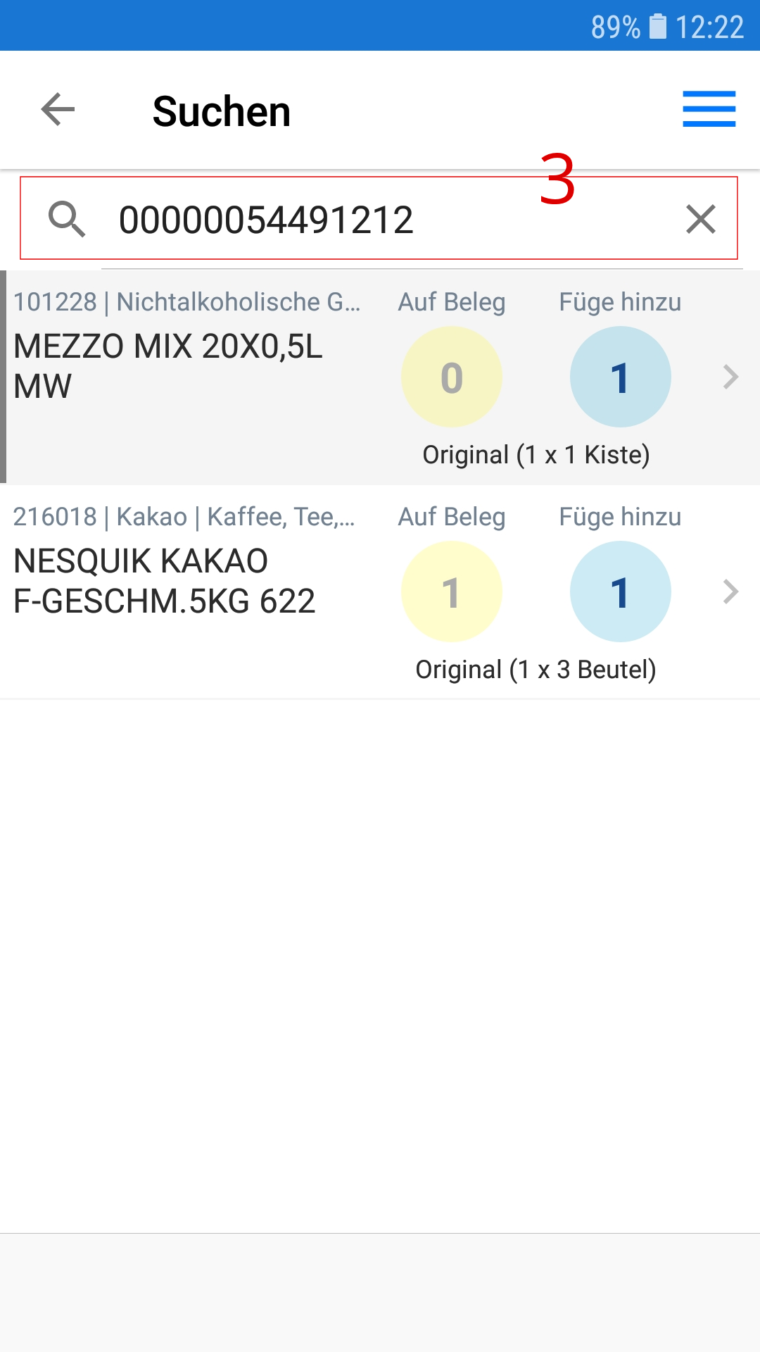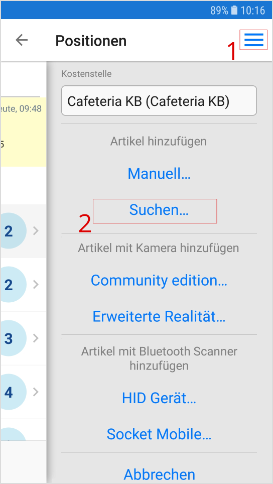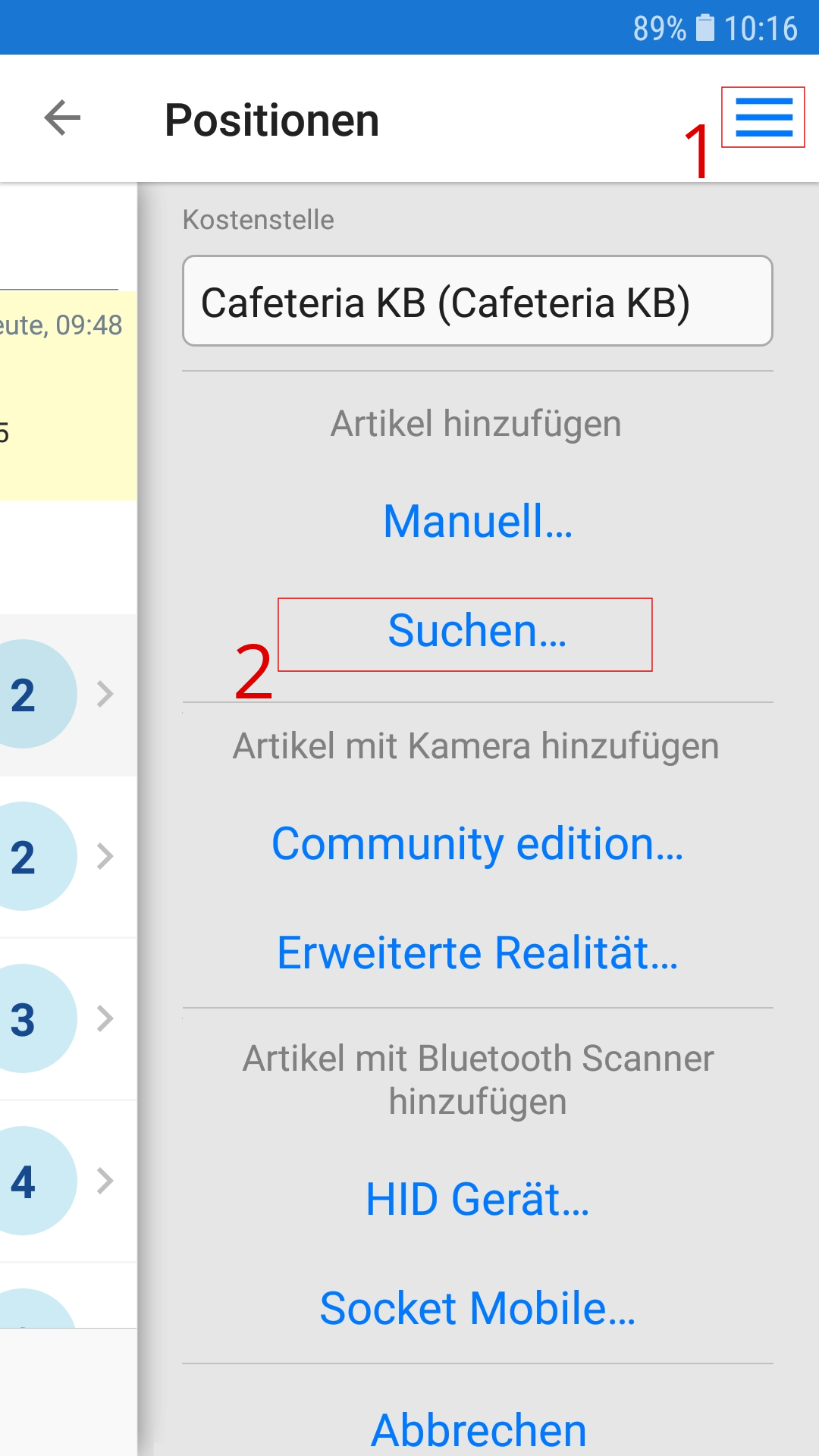 Den Beleg, deren Positionsliste Sie erweitern wollen, haben Sie ausgewählt und mit Anwahl des Menü-Icons die Artikelliste geöffnet (s. Markierung 1).