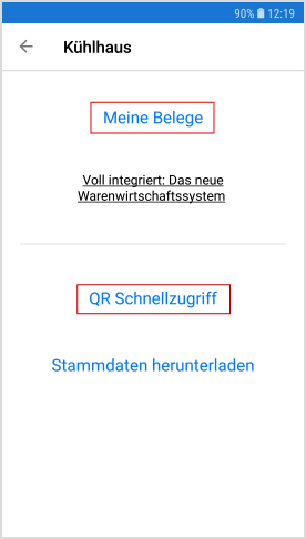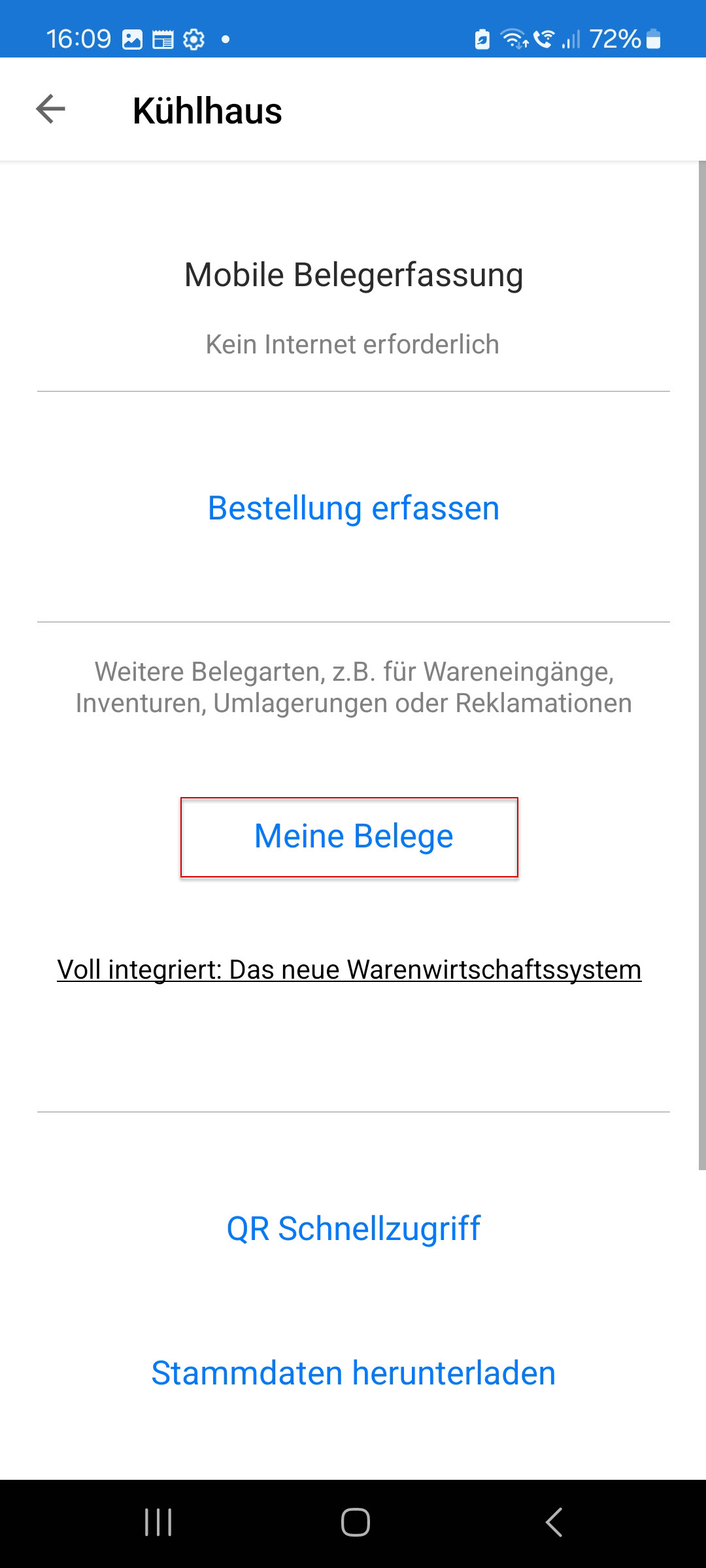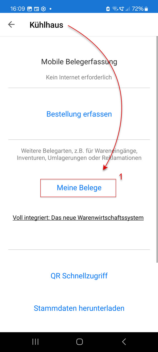 Sie starten die Bestell-App sellyping, wechseln in den Bereich Kühlhaus und öffnen mit Auswahl der Funktion Meine Belege (s. Markierung 1) die Belegliste.
