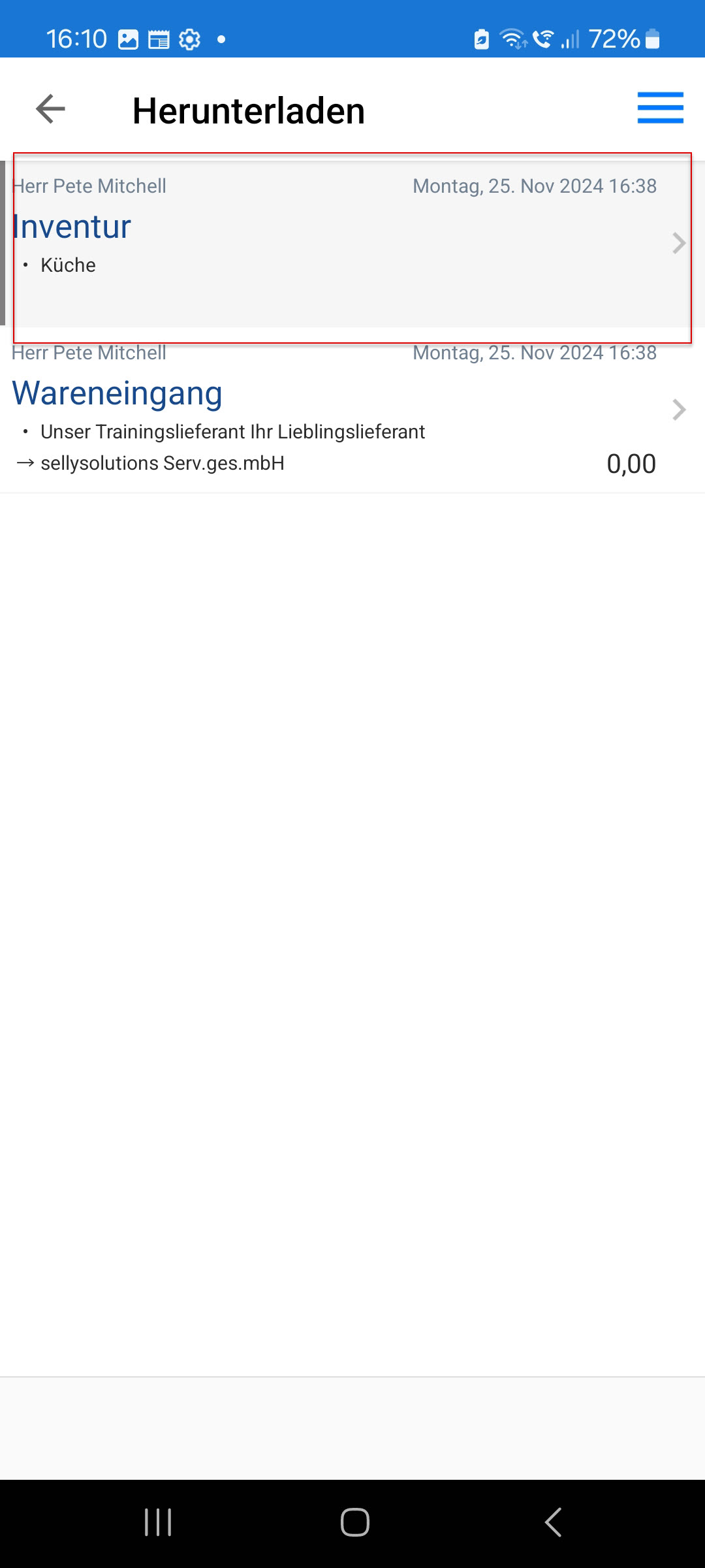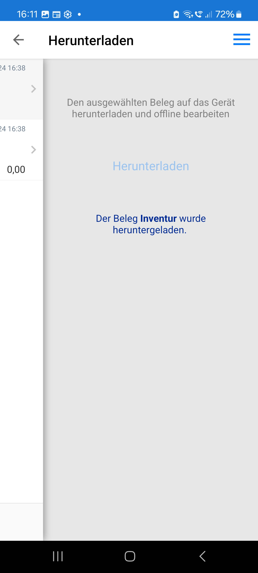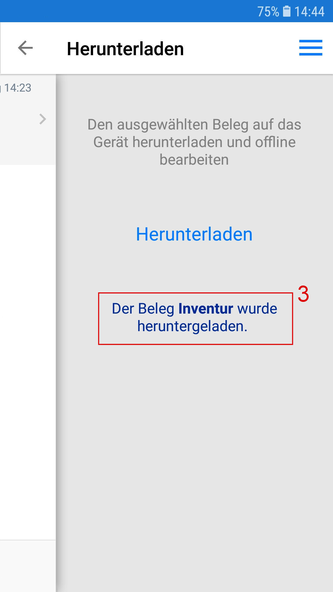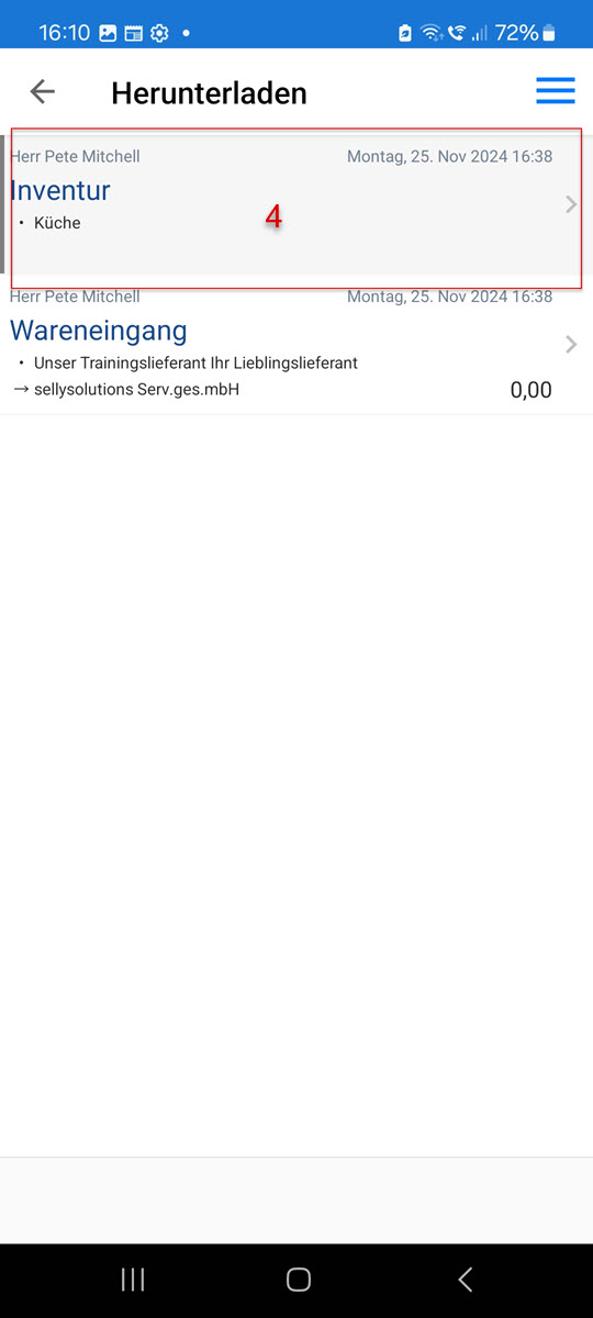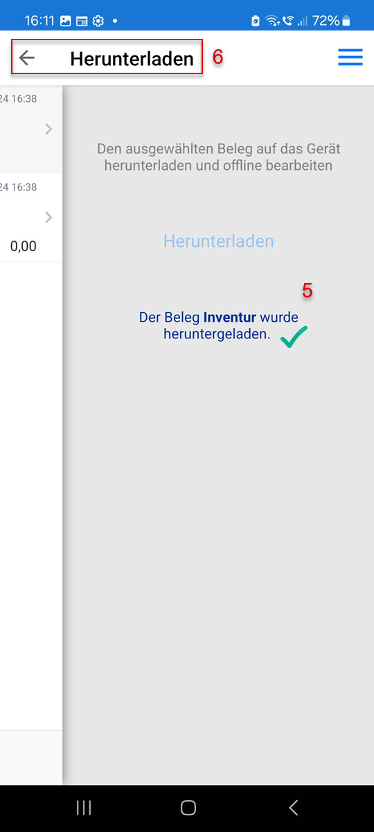 In der Belegliste wählen Sie Ihren Beleg aus. Im Bildbeispiel wird ein Inventurbeleg zum Herunterladen verwendet (s. Markierung 4). Für diesen Vorgang ist ein Internetzugang erforderlich.