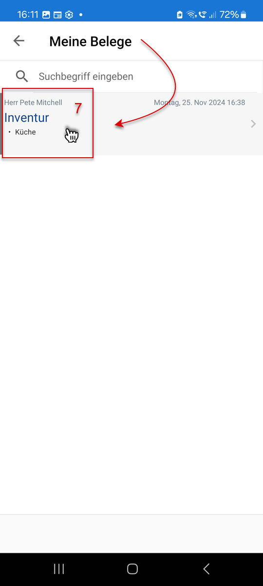 Zur Auswahl des Beleges klicken Sie auf die zutreffende Belegzeile (s. Markierung 7) und können jetzt den Beleg weiterbearbeiten, so bspw. Positionen ergänzen oder Mengenangaben aktualisieren.