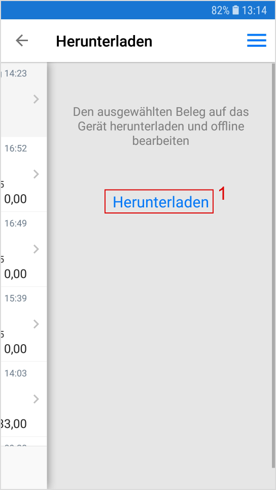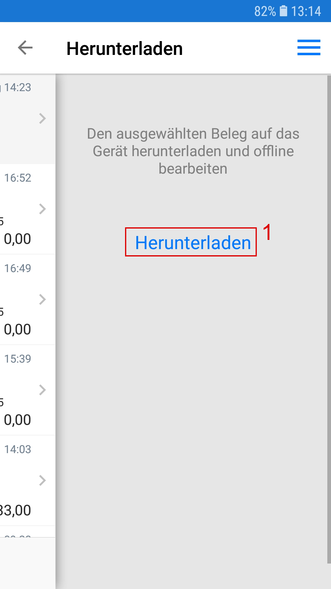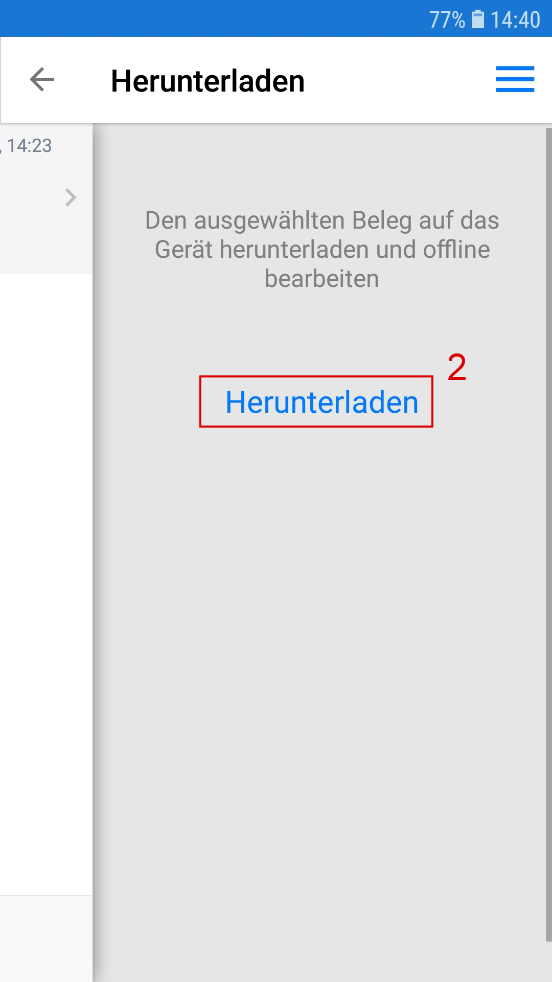 Mit Antippen dieses Beleges erhalten Sie nebenstehenden Hinweis und nutzen 2x den Link Herunterladen (s. Markierungen 1 + 2). Sie laden zuerst die Belegliste und nachfolgend den zutreffenden Beleg.